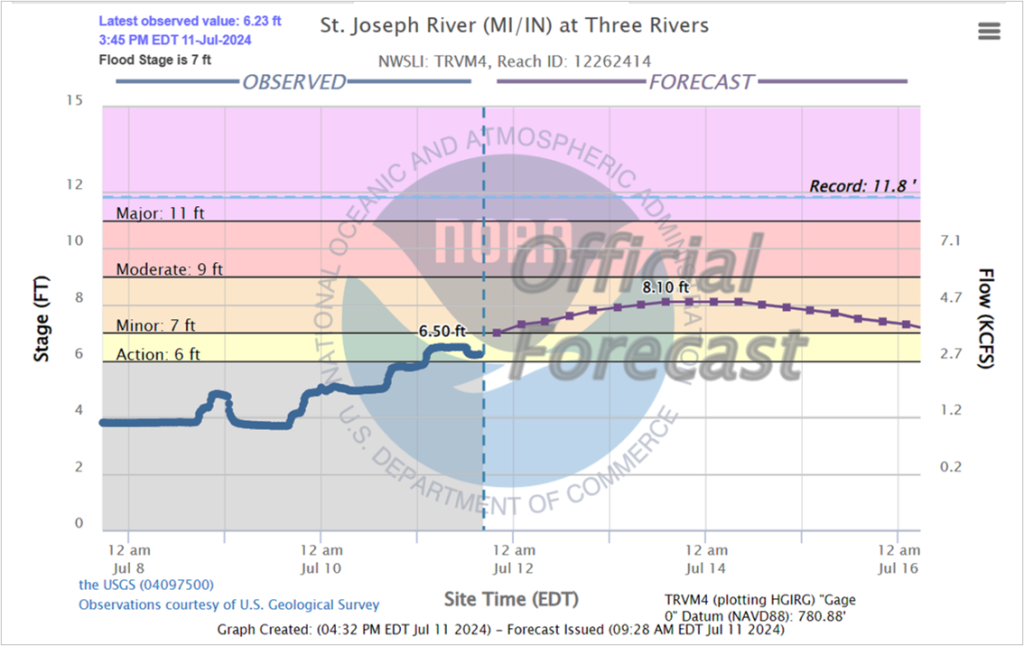 Forecasts for the St. Joseph River (MI/IN) at Three Rivers are issued as needed during times